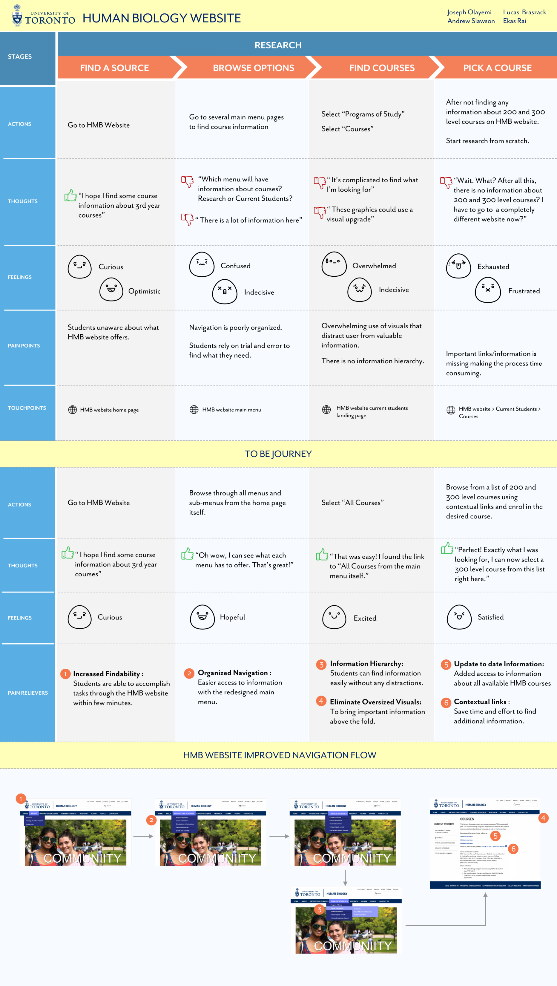 The University of Toronto's Human Biology department came to our student team requesting a website evaluation and redesign. The main goal of this project was to represent UX design to our client and demonstrate the user's journey via experience maps, with both an “As-Is” scenario and an improved “To-Be” scenario.